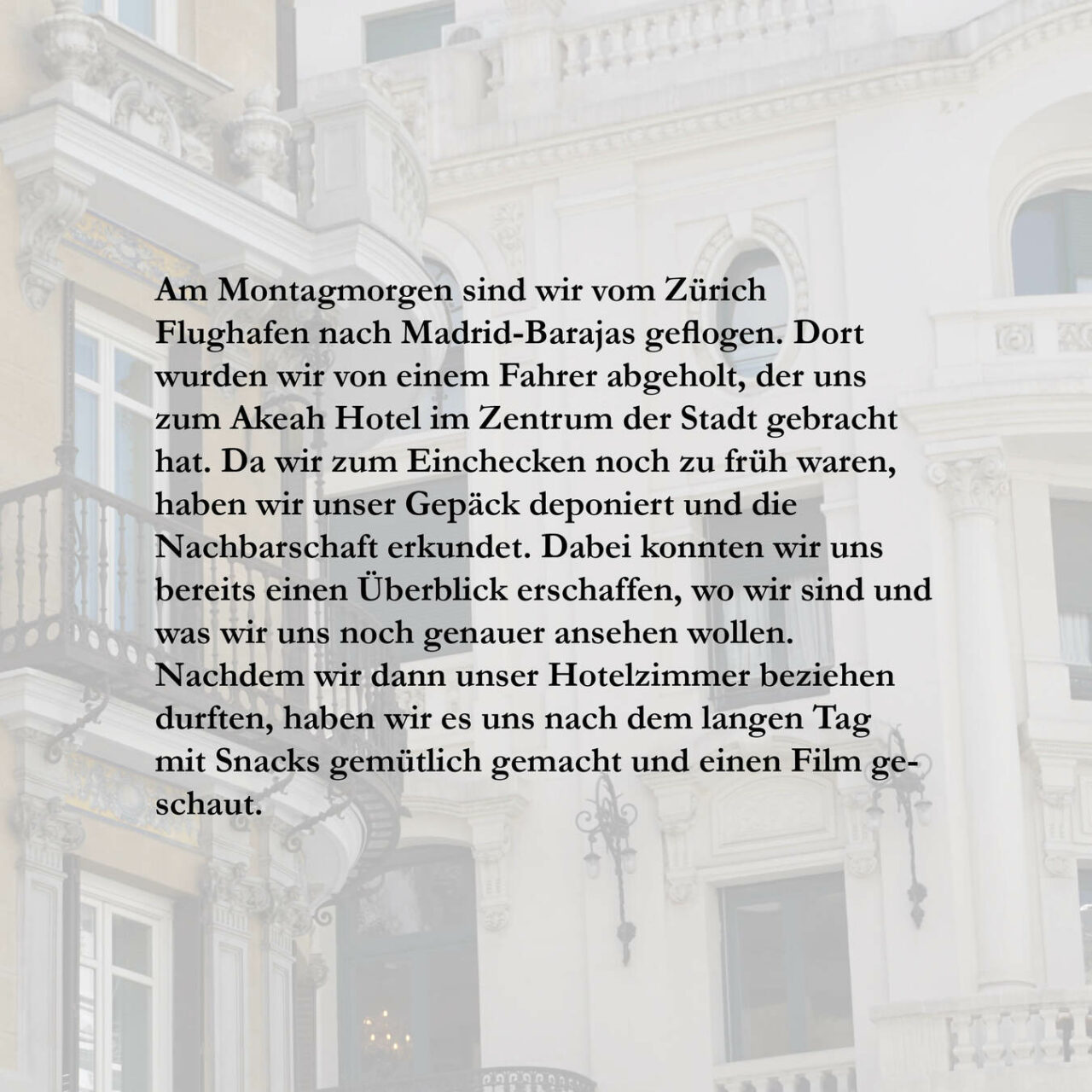 Hier ist ein Beispiel für den ersten Tag in Madrid. Die restlichen sind auf meinem Instakanal einsehbar.
