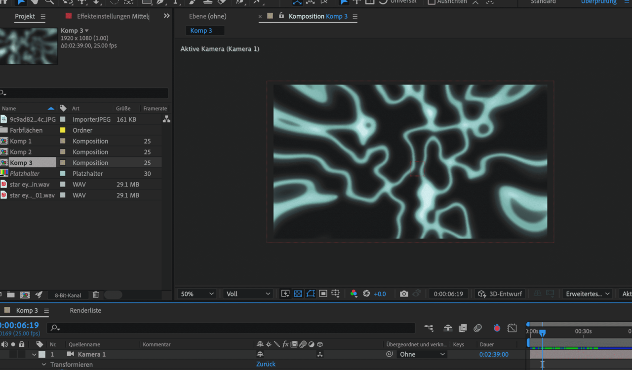 Nachdem Natascha den fertigen Track geliefert hatte, begann ich mit der Arbeit an den Visualisierungen. Es wurden vier bis fünf verschiedene Entwürfe erstellt, die jeweils unterschiedliche visuelle Ansätze verfolgten. Letztlich entschied ich mich für den zuletzt erstellten Entwurf. Die Synchronisation der Visualisierungen mit dem Audio-Track stellte eine interessante Herausforderung dar, die jedoch durch die „Expressions“-Funktion von „After Effects“ intuitiv umgesetzt werden konnte.