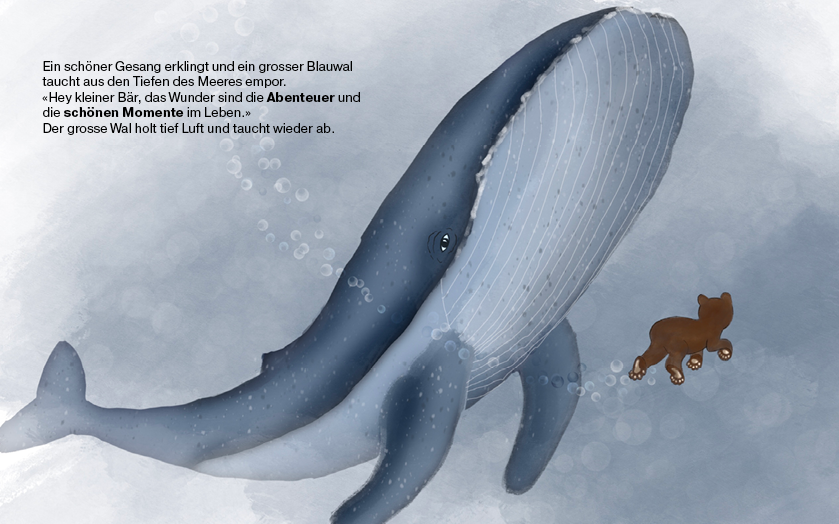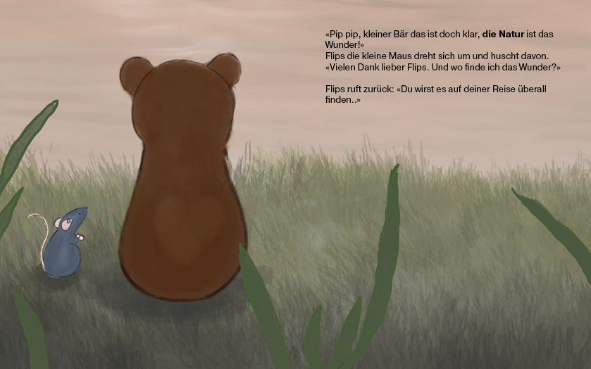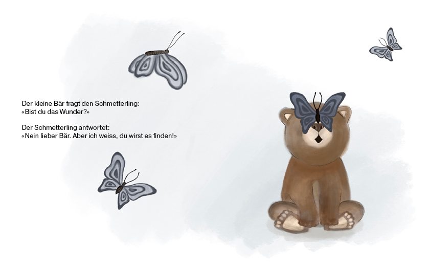 Für mich ist ein Kinderbuch nicht gleich ein Kinderbuch. Meistens hat es viel Sinn dahinter oder ist voll mit Lerneffekten für Kinder. Ich durfte auch schon für meine Maturarbeit ein Kinderbuch entwickeln, in welchem das Umstrittene Buch «Struwwelpeter» pädagogisch hinterfragt wurde und neu entworfen wurde. Diesesmal sollte das Kinderbuch einen tieferen Sinn ergeben. So entstand die Reise von einem kleinen Bären, welcher die Reise bis zur Geburt zeigt. Er sucht nach dem Wunder und bekommt viele Antworten welche auf den kleinen Bären schliessen lassen. Nachdem die Geschichte entstanden war, wurde skizziert, verworfen und gemalt. Ich habe mich entschieden mit Aquarell zu arbeiten, da die Wasserfarbe fein und verspielt wirkt.