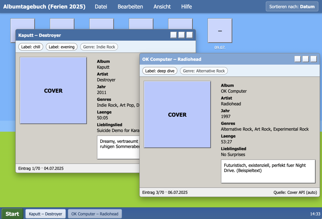 Die Idee entstand aus dem Wunsch, bewusst Musik zu hören und meinen Alltag zu entschleunigen. Ich merkte, dass ich in den Monaten vor den Sommerferien oft dieselben Playlists hörte. Also bat ich ChatGPT jeden Tag ein Album vorzuschlagen, welches zu meinen Lieblingsgenres passen. Daraus wurde eine tägliche Routine: Ein Album am Tag, von Anfang bis Ende, mit Notizen, Rating und einem Lieblingssong. Dass die Präsentation am Ende wie ein Windows-XP-Desktop aussieht, war eine spontane Entscheidung. Nostalgie pur und ein bewusstes Stilmittel, um das Projekt visuell besonders zu machen.