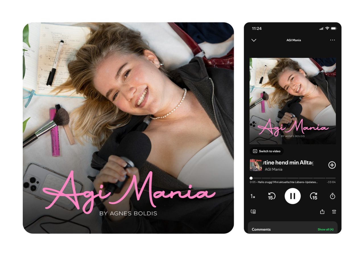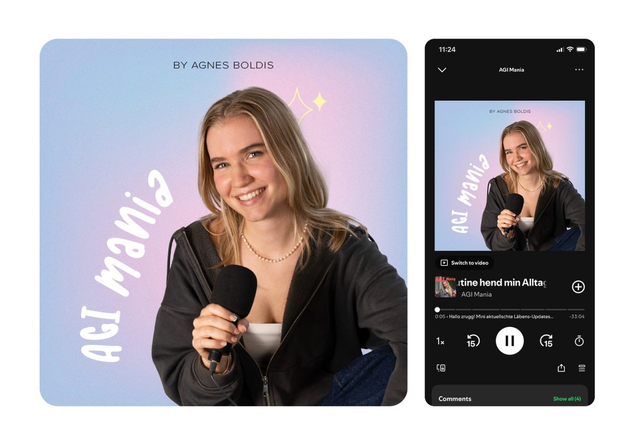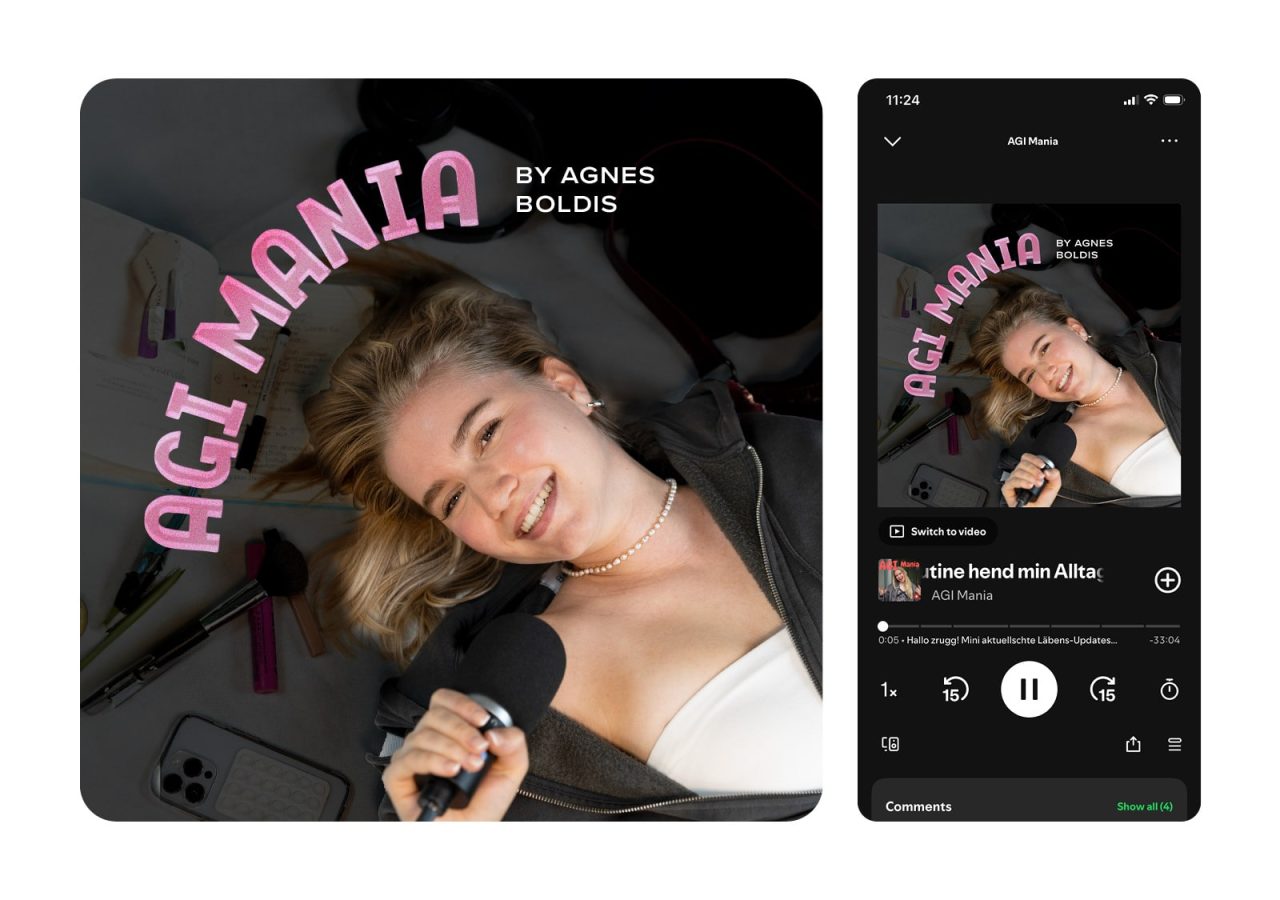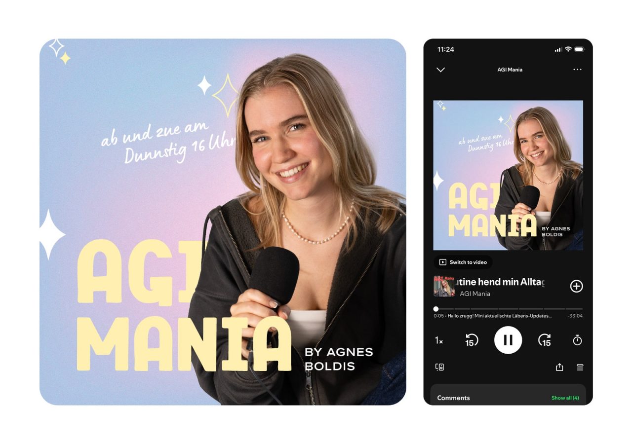 Für den Podcast Agi Mania durfte ich meine Mitstudentin Agnes bei der Gestaltung eines neuen Covers unterstützen. Ziel war es, ein visuelles Erscheinungsbild zu entwickeln, das nicht nur den Podcast repräsentiert, sondern vor allem ihre Persönlichkeit als Host widerspiegelt.