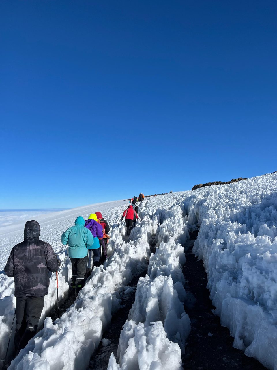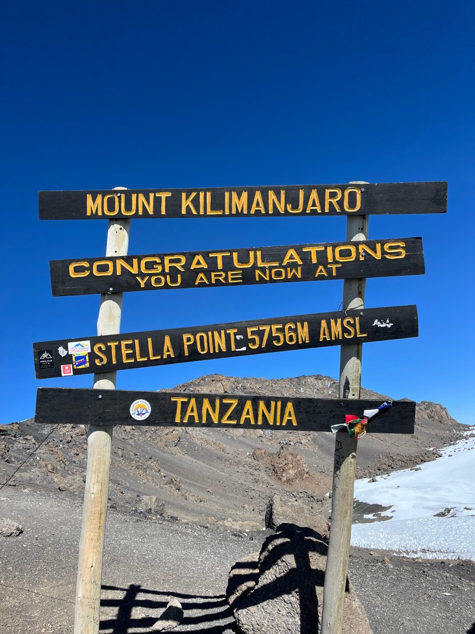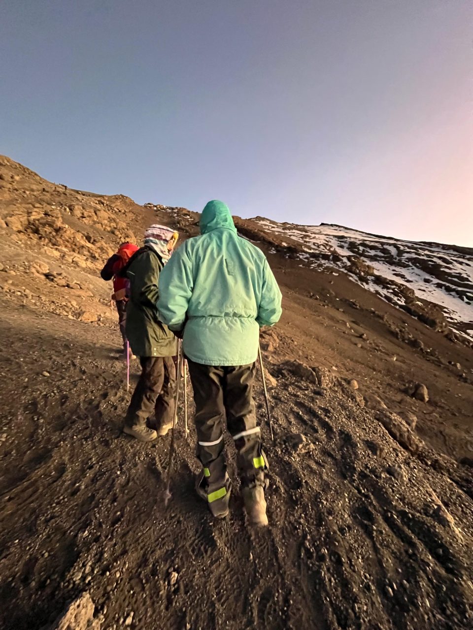 Der Aufstieg zog sich über mehrere Stunden und verlangte sowohl körperlich als auch mental alles ab. Kurz nach Sonnenaufgang erreichten wir zuerst den Stella Point. Dort war der Wind extrem stark, sodass wir uns kaum auf den Beinen halten konnten. Trotz der Erschöpfung gingen wir weiter, Arm in Arm, um dem Wind standzuhalten. Die letzten Meter bis zum Uhuru Peak forderten nochmals alle verbleibenden Kräfte. Gegen 8:30 Uhr erreichten wir schliesslich den höchsten Punkt Afrikas. Der Moment oben war ruhig und gleichzeitig überwältigend, geprägt von Erleichterung, Stolz und grosser Müdigkeit. Lange bleiben konnten wir jedoch nicht, da der Abstieg noch bevorstand.