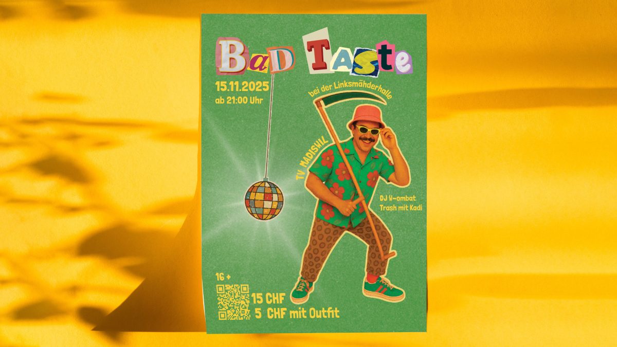 Für die Bad Taste Party des Turnvereins Madiswil habe ich den Flyer und Sticker gestaltet. Ziel war ein auffälliges, humorvolles und bewusst unperfektes Design, das sich klar vom klassischen Vereinsauftritt abhebt. Gestalterisch sollten sowohl die Farben des Vereins als auch der lokale Bezug sichtbar werden, insbesondere das Vereinsgrün und Elemente aus dem Dorfwappen.