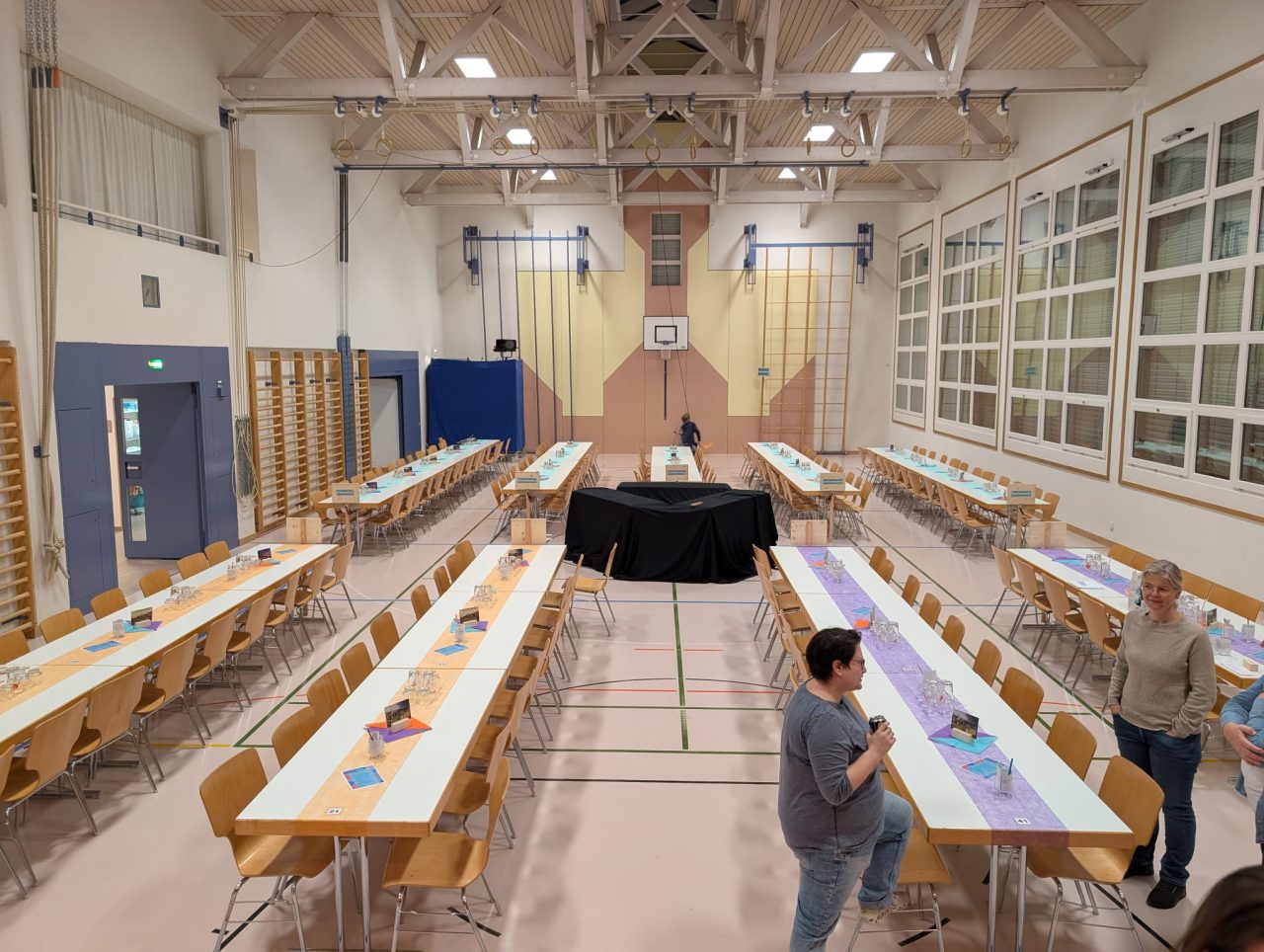 Unser Ziel als OK war es, dass sich das Publikum als Teil der Inszenierung fühlt, bereits mit der Ankunft im «Gruberhof» in die bevorstehende Geschichte eintaucht und sich fragt, was da auf sie zukommt. Dafür dekorierten wir den Saal in den drei Farben des Flyers, stellvertretend für die drei im Theater vorkommenden Dörfer. Zweites Amuse-Bouche war die Platzeinteilung. Wir nahmen die Besucher:innen in Empfang und gaben ihnen ihre «Adresse» bekannt, zum Beispiel: «Ihr wohnt im Chrottentobel 47 in Muttwilen.» Dank der Strassenschilder fanden sie so ihren Platz. Das letzte Goodie, das auf das Stück «gluschtig» machen sollte, war auf den Tischen verteilt. KI-generierte Postkarten-Motive der drei Dörfer, passend zu deren Charakteristik im Stück, konnten noch am gleichen Abend an Freunde, Familie, Bekannte versandt werden.