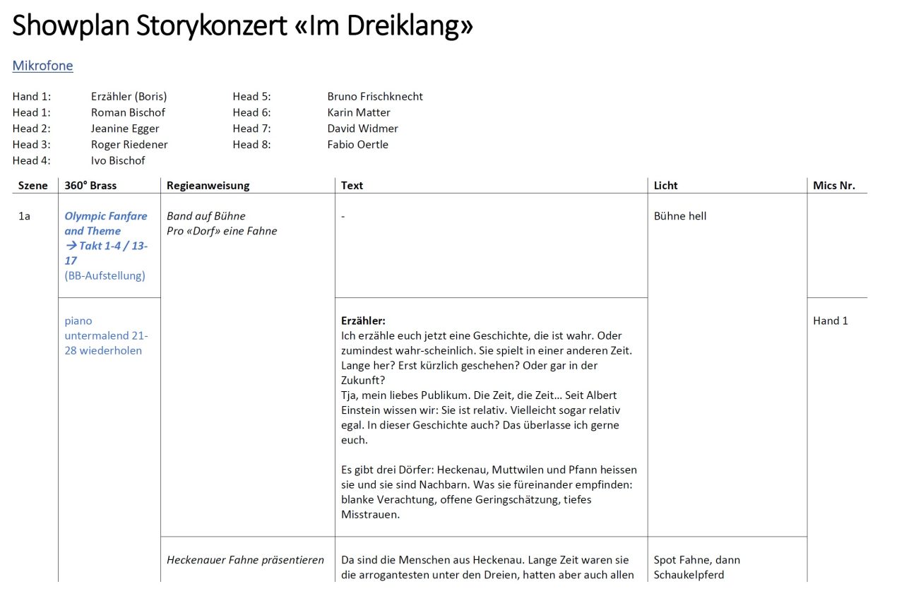 Als persönliche Vorbereitung auf meine Aufgabe als Regisseur erstellte ich einen Regieplan, der nebst Drehbuch und Musik weitere Angaben, zum Beispiel technische Anweisungen, beinhaltete.