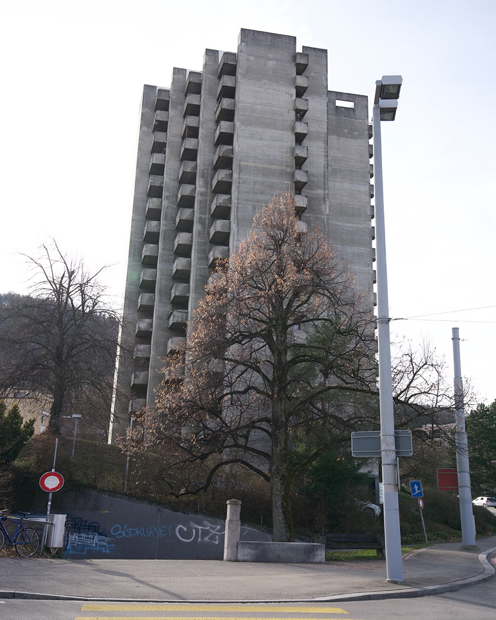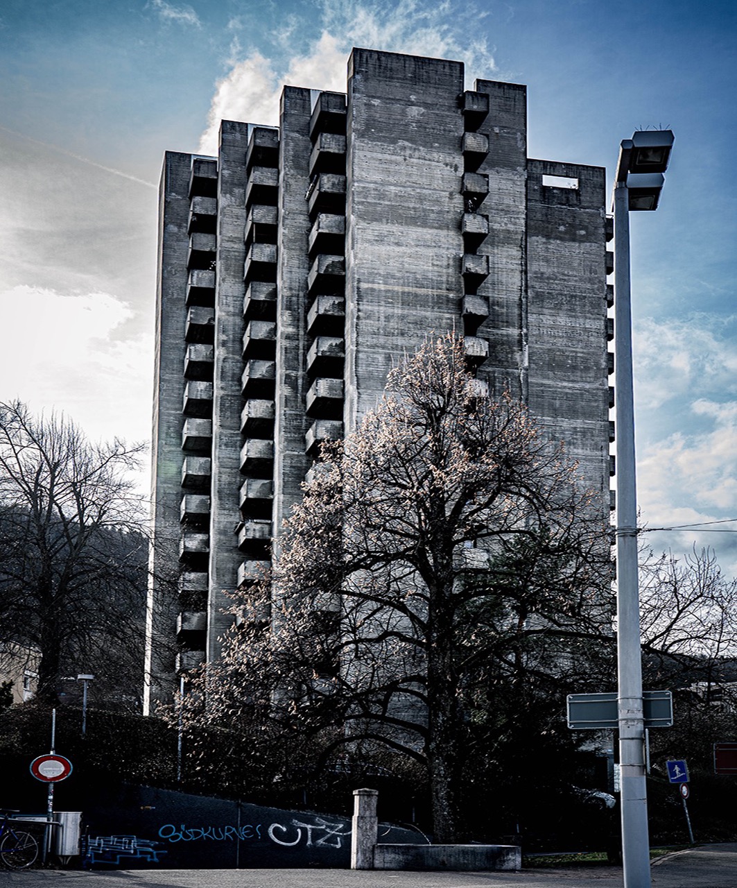Direkt an der Haltestelle Triemli in Zürich, befindet sich, laut einer 20 Minuten Abstimmung aus 2018, das hässlichste Hochhaus der Schweiz. Das 1966 fertiggestellte Gebäude hat schon damals sehr polarisiert und das macht es auch heute noch. Auch ich bin jedes Mal irritiert wenn ich das Gebäude vor mir habe. Deshalb habe ich davon ein Foto gemacht. Es eckt an, und das wortwörtlich. Der Baustil erinnert an den Brutalismus und das habe ich in der Bearbeitung des Fotos auch versucht hervorzuheben.