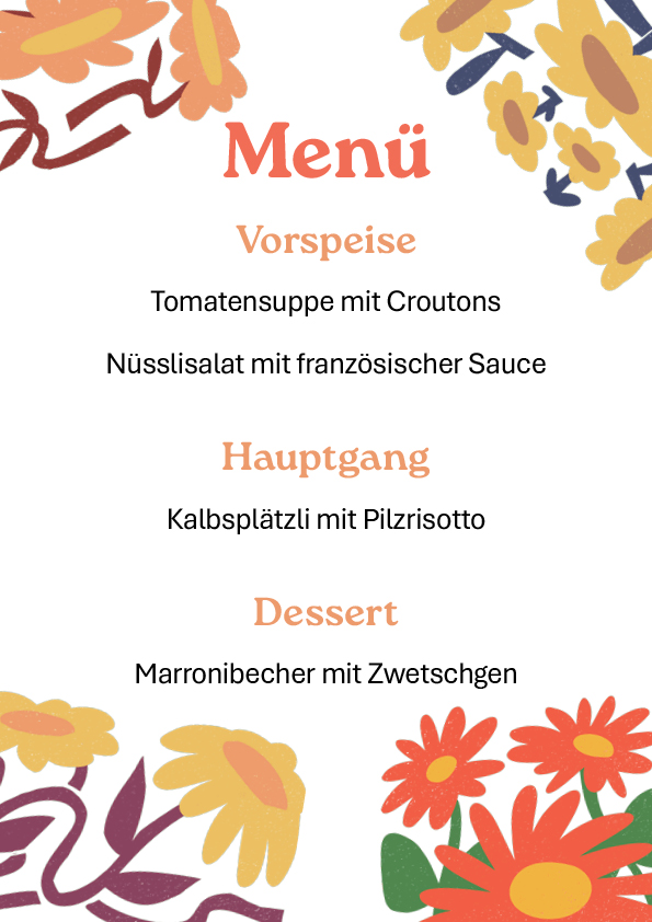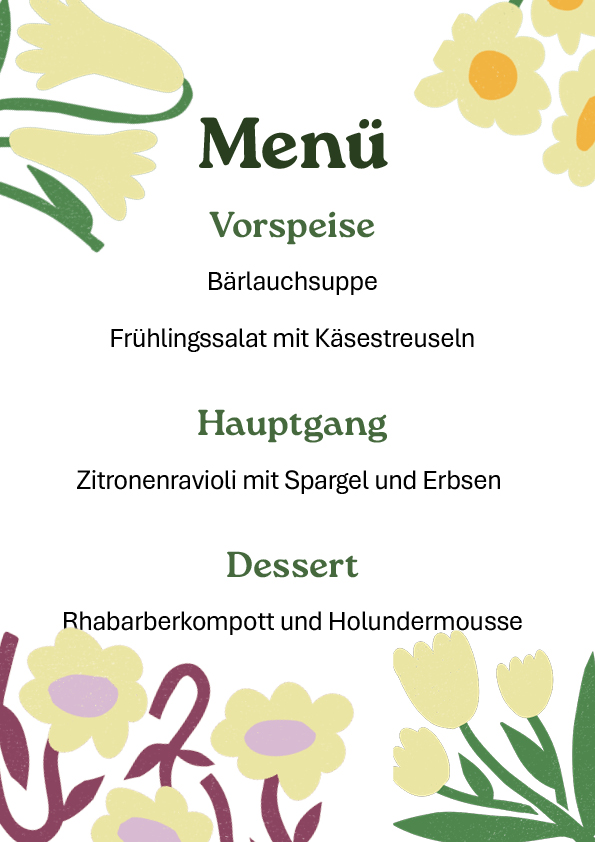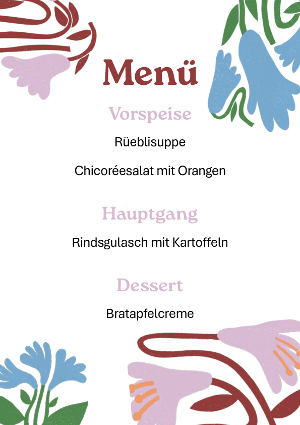 Für den Mittagsclub in Muttenz durfte ich einen Flyer und saisonale Menükarten gestalten. Das Ziel: Seniorinnen und Senioren zu einem gemeinsamen Mittagessen einzuladen – mit gutem Essen und schöner Gesellschaft.