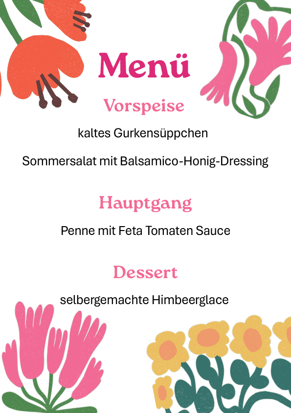 Zusätzlich zum Flyer habe ich auch saisonale Menükarten gestaltet. Sie ergänzen das Konzept und zeigen, was auf den Tisch kommt – frisch, regional und abwechslungsreich. So entsteht ein stimmiges Gesamtbild, das Lust macht, vorbeizuschauen.