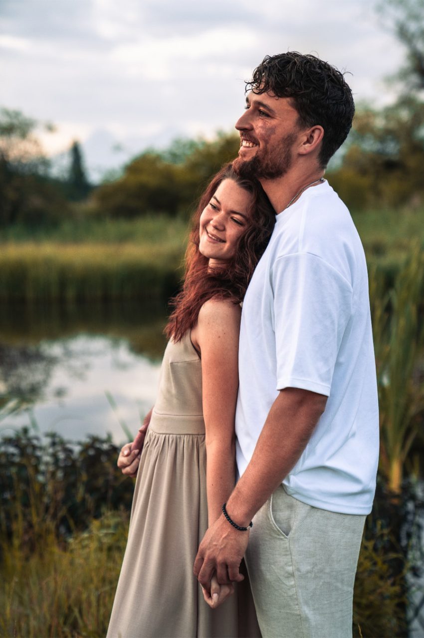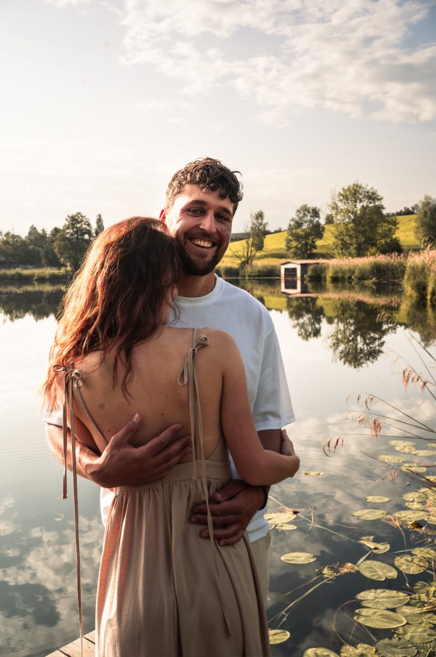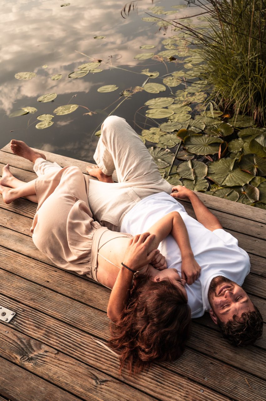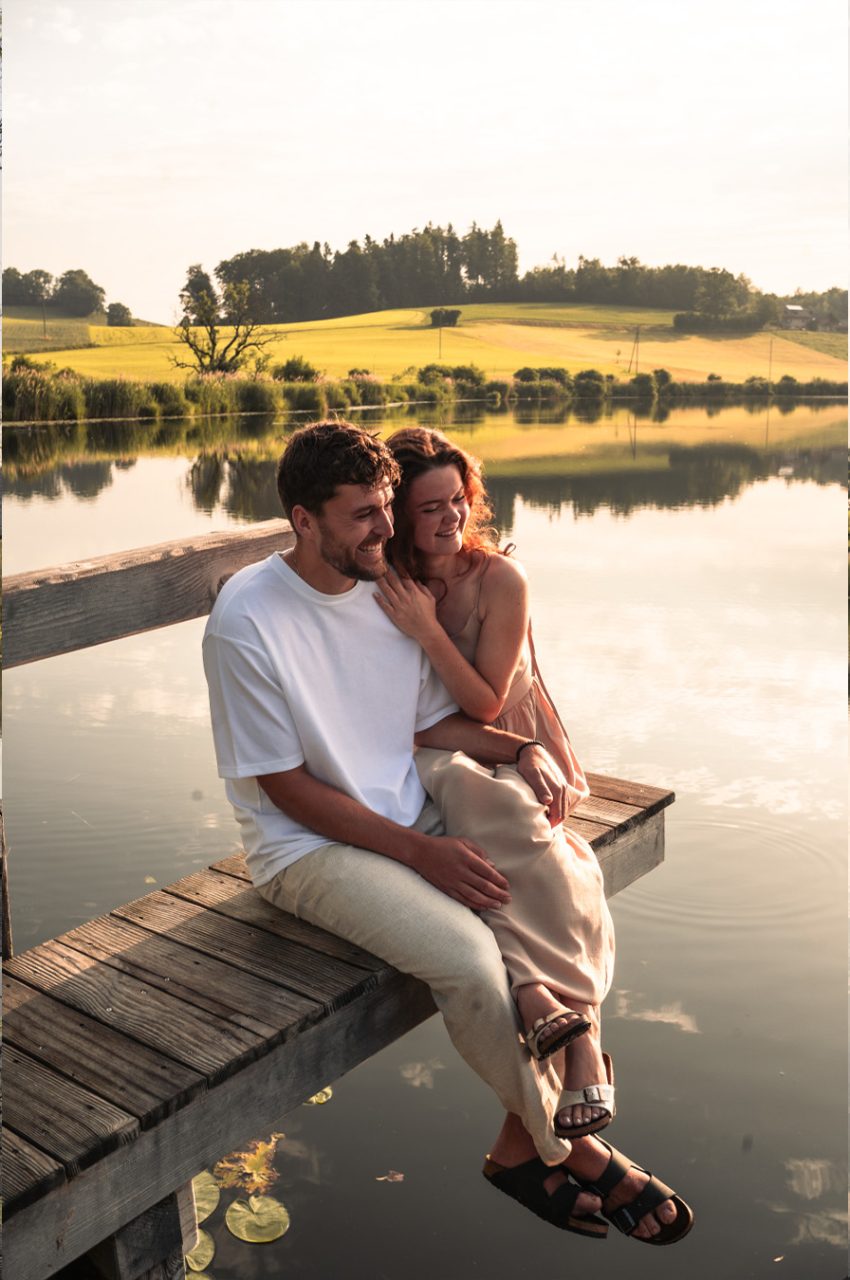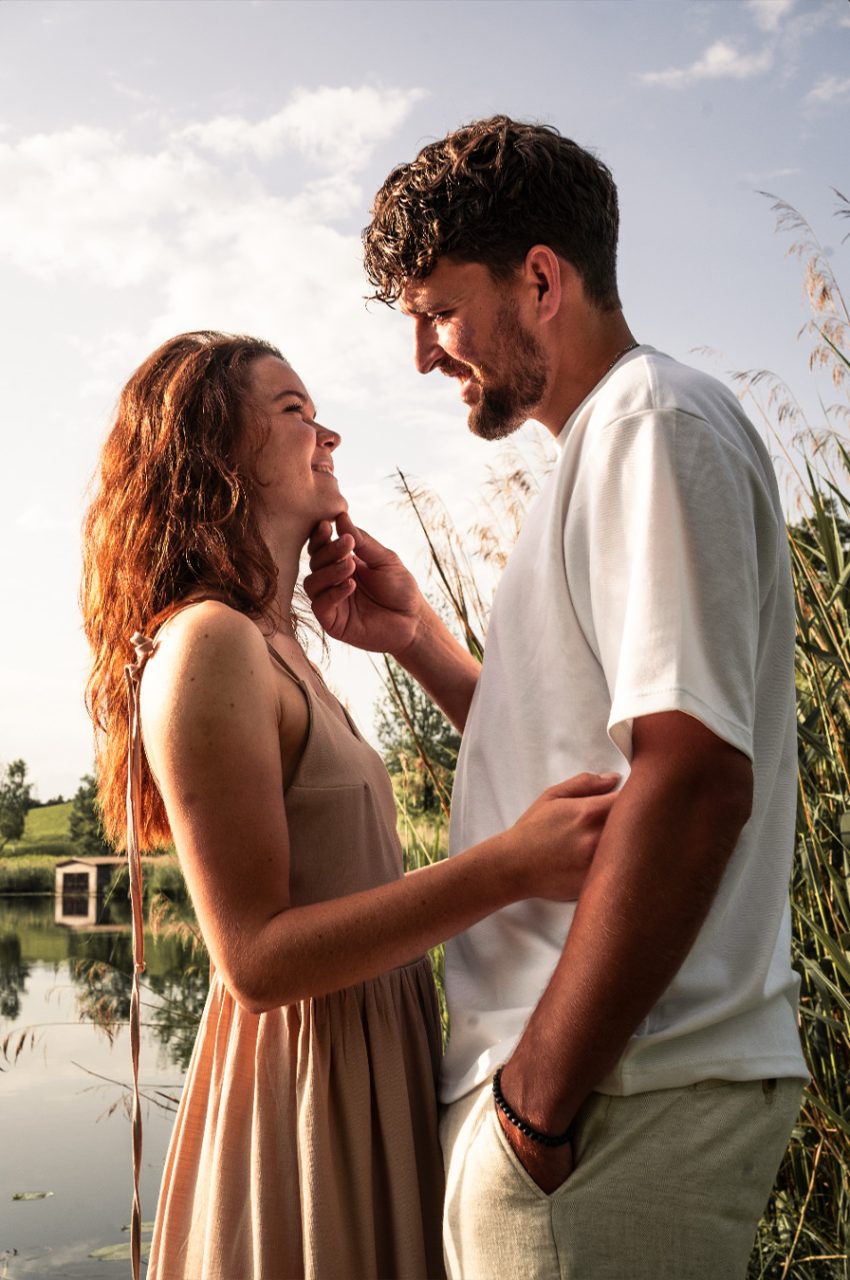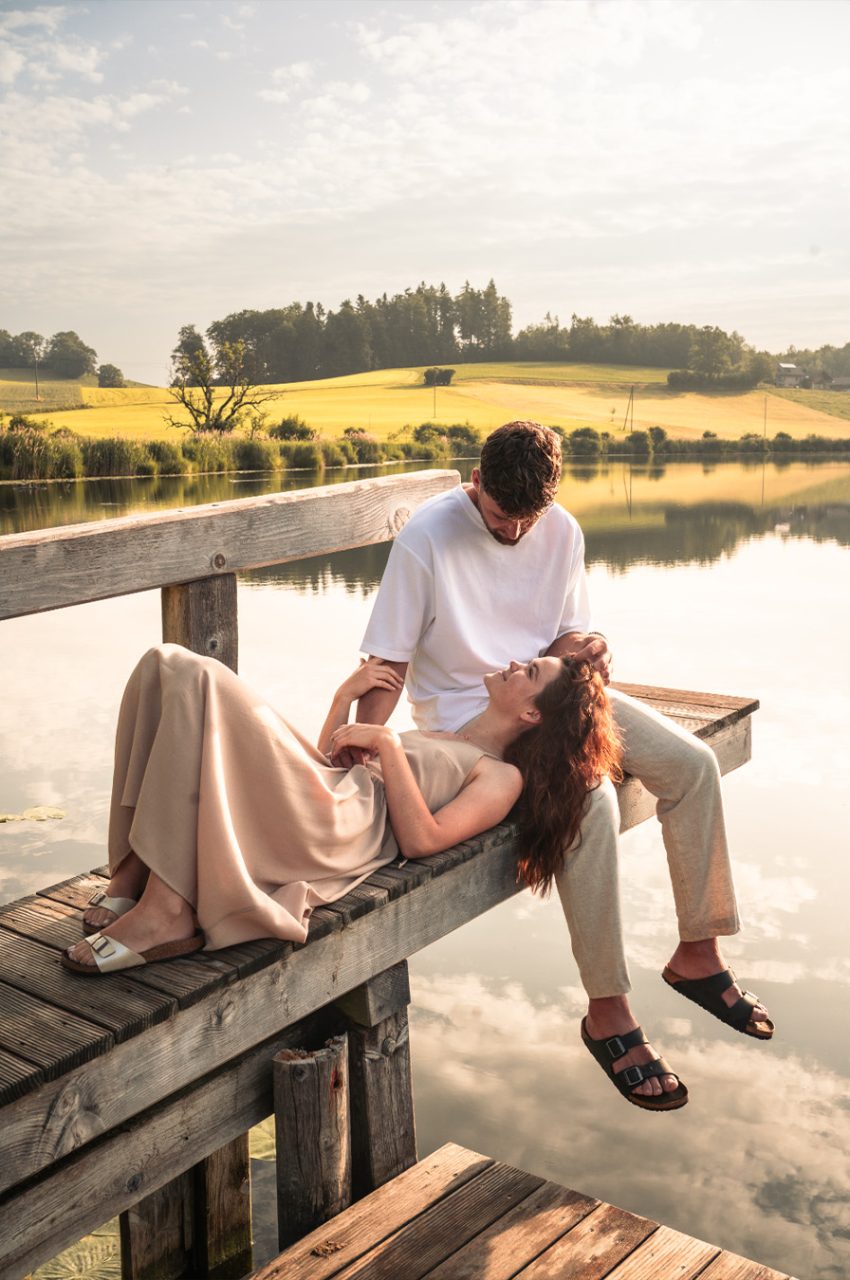 Die Bildserie funktioniert vor allem durch die warme Stimmung und das weiche Morgenlicht sehr gut. Die ruhige Umgebung am See und die natürlichen Farben unterstützen den verträumten, romantischen Look. Besonders gelungen ist, dass Nähe nicht über klare Posen, sondern über kleine Gesten, Körperhaltung und Details gezeigt wird. Dadurch wirken die Bilder ehrlich und unaufgeregt.