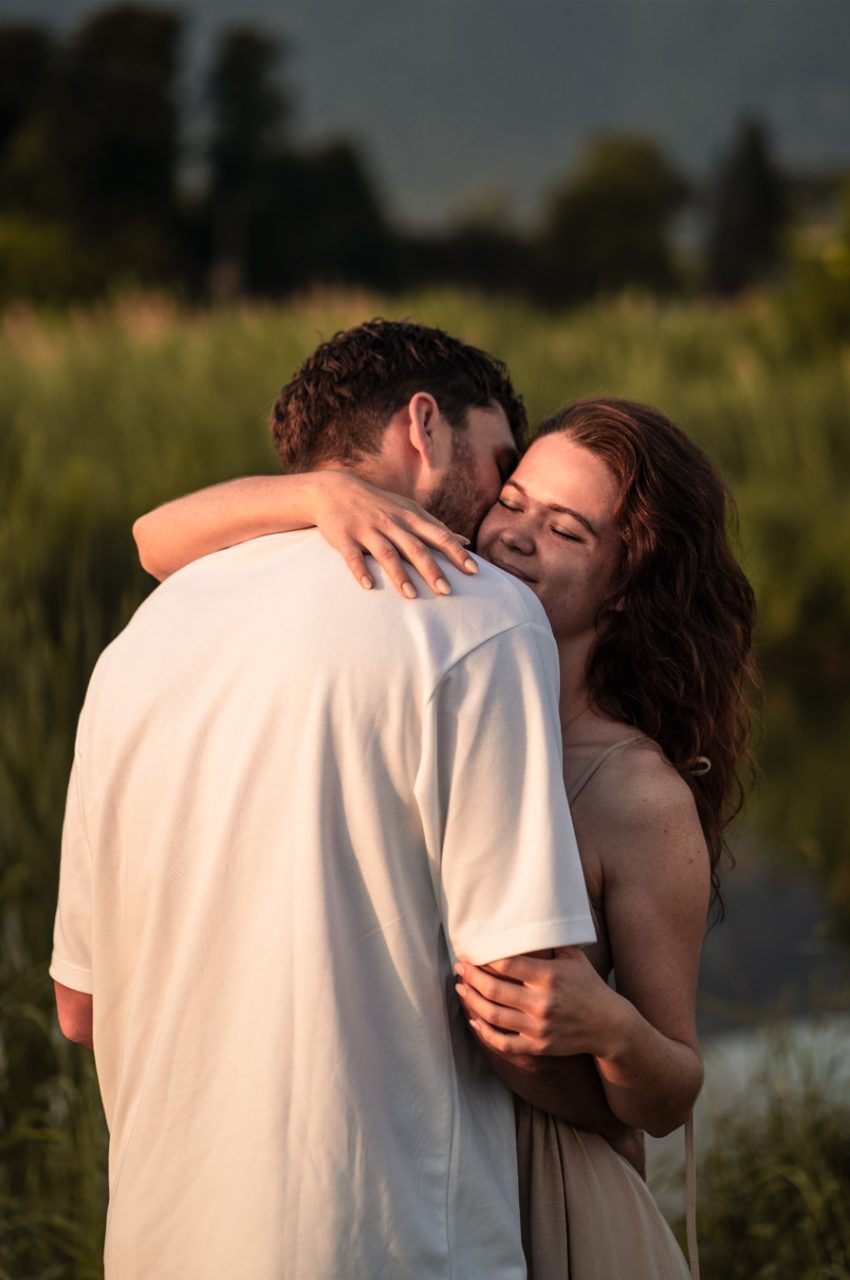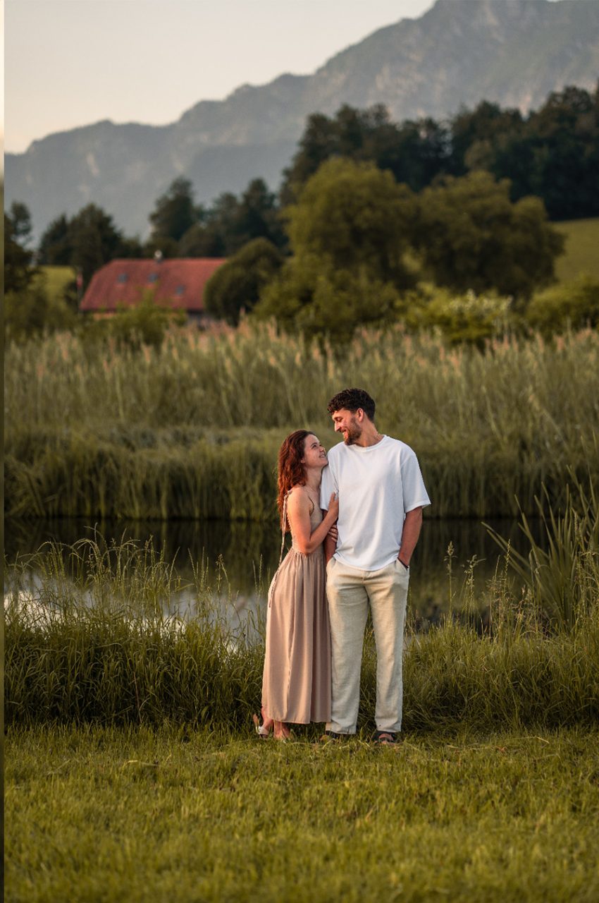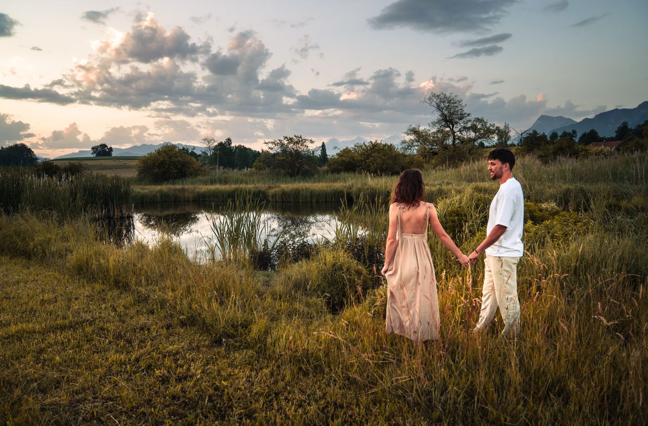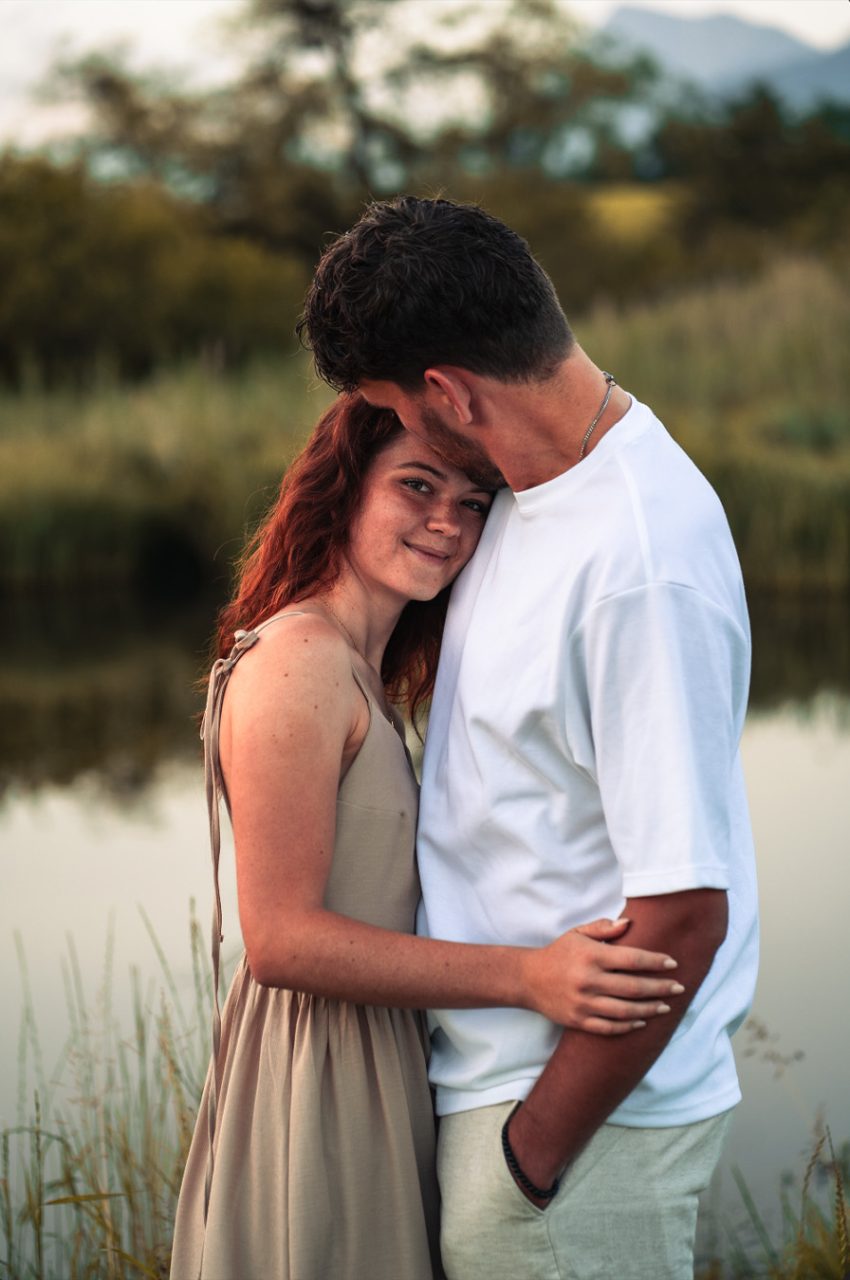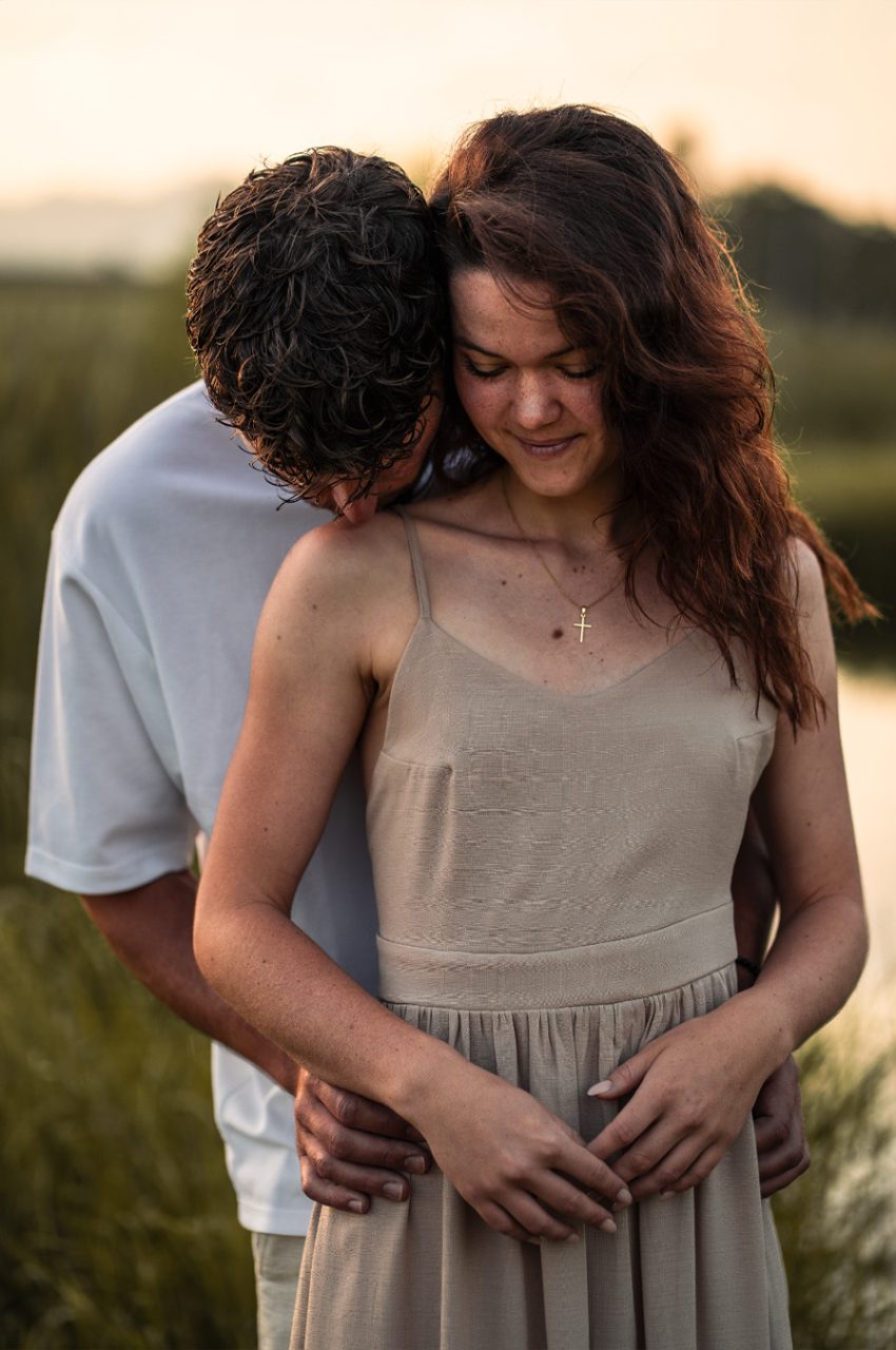 Die Bildserie funktioniert vor allem durch die warme Stimmung und das weiche Morgenlicht sehr gut. Die ruhige Umgebung am See und die natürlichen Farben unterstützen den verträumten, romantischen Look. Besonders gelungen ist, dass Nähe nicht über klare Posen, sondern über kleine Gesten, Körperhaltung und Details gezeigt wird. Dadurch wirken die Bilder ehrlich und unaufgeregt.