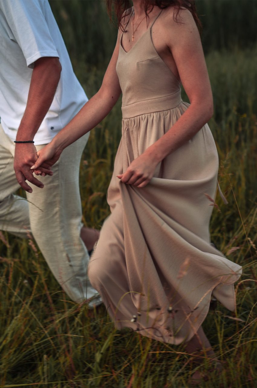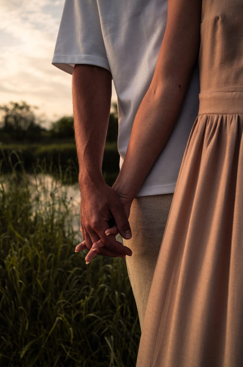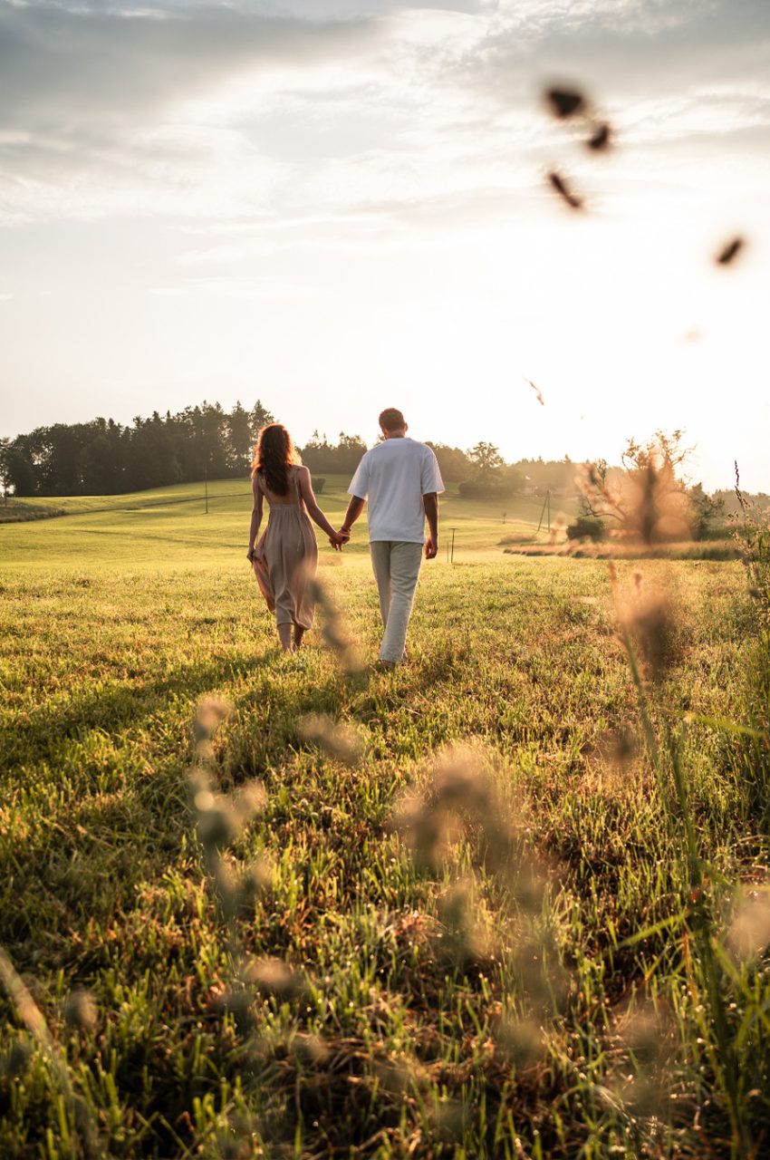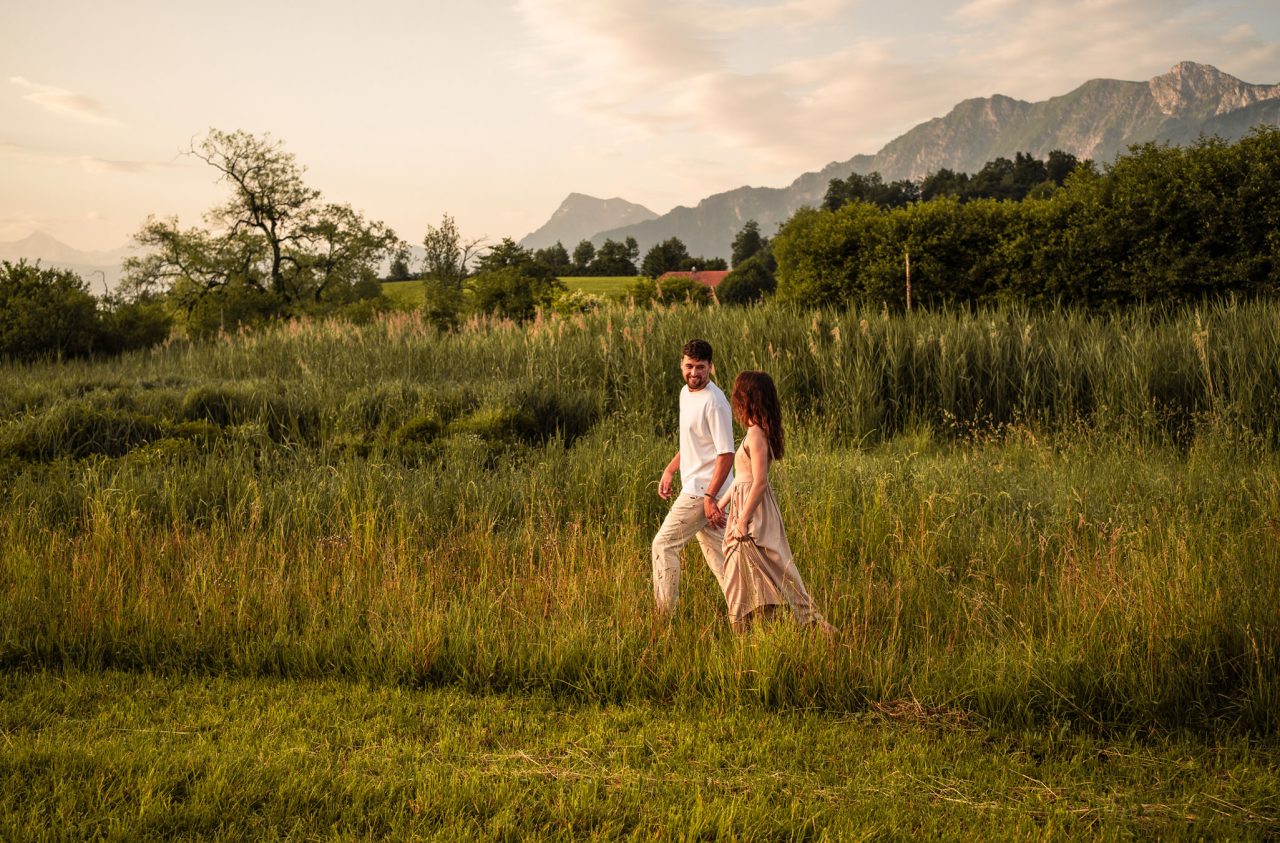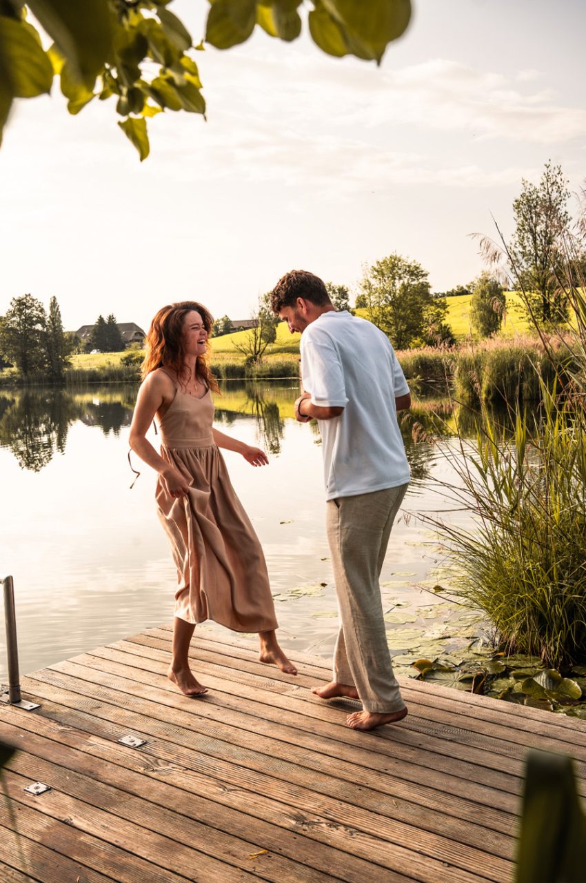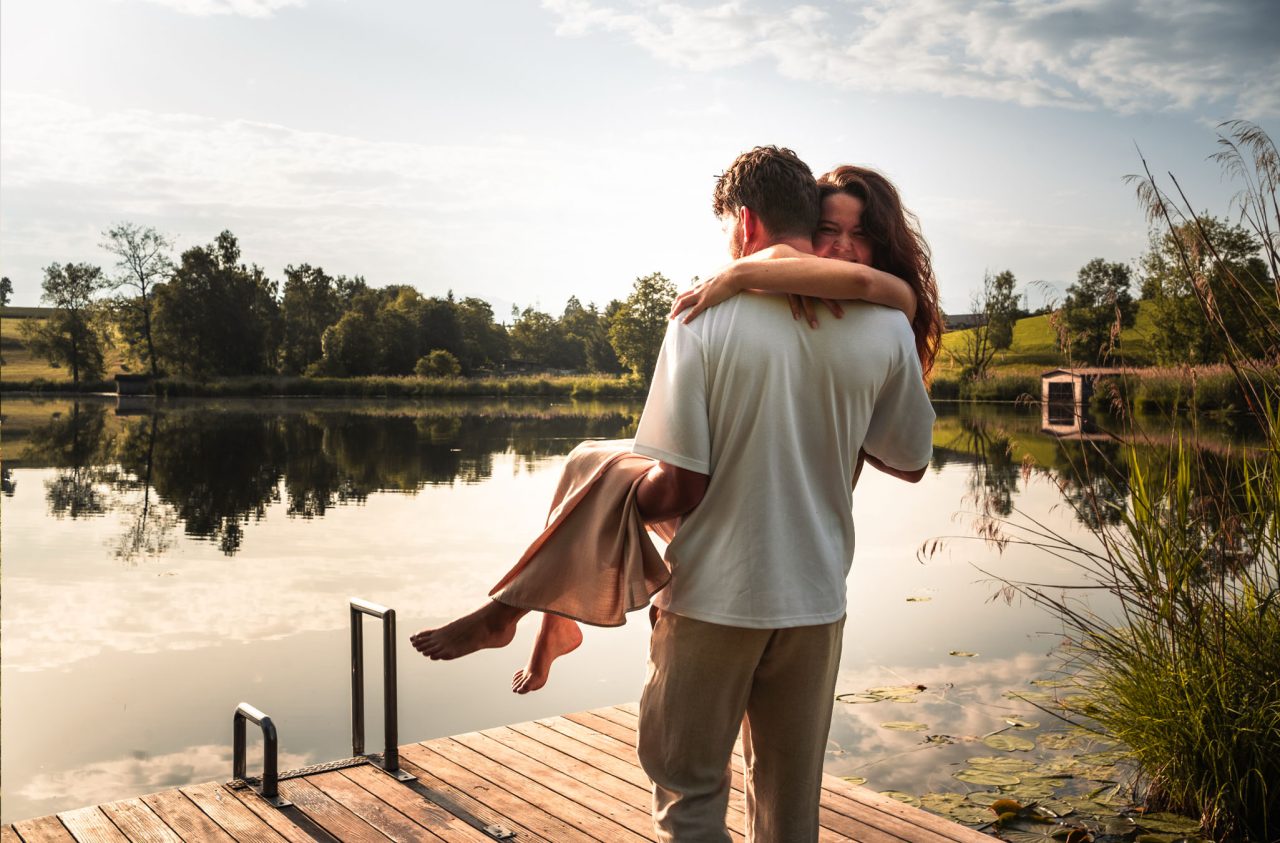 Die Bildserie funktioniert vor allem durch die warme Stimmung und das weiche Morgenlicht sehr gut. Die ruhige Umgebung am See und die natürlichen Farben unterstützen den verträumten, romantischen Look. Besonders gelungen ist, dass Nähe nicht über klare Posen, sondern über kleine Gesten, Körperhaltung und Details gezeigt wird. Dadurch wirken die Bilder ehrlich und unaufgeregt.