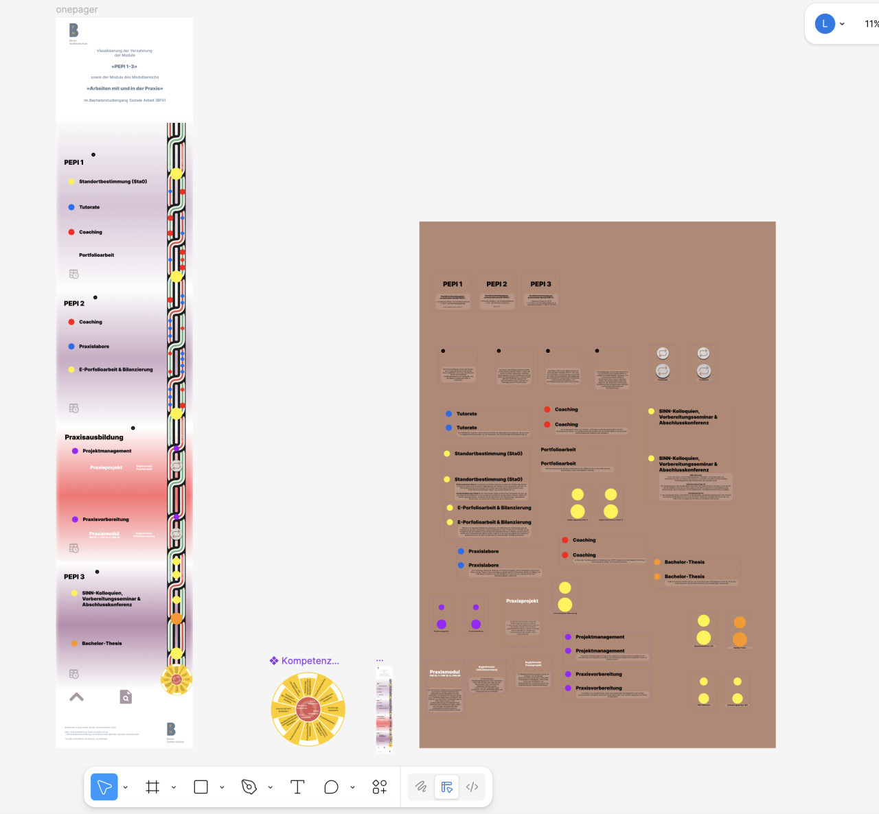 Im Rahmen des Moduls Digezz entwickelte ich ein interaktives digitales Tool zur Visualisierung des Zusammenspiels der Module «Persönliche Entwicklung einer professionellen Identität (PEPI 1–3)» sowie der Module des Modulbereichs «Arbeiten mit und in der Praxis» im Bachelorstudiengang Soziale Arbeit.