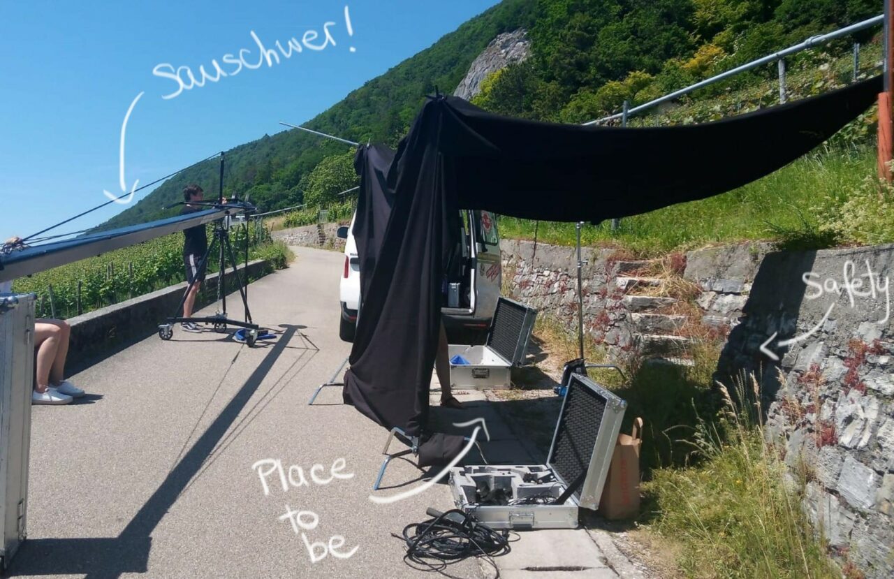 Eine denkbar ungünstige Lösung, die uns alle an unsere Grenzen brachte. Sobald das Büssli heranratterte, mussten sich jeweils drei von uns aus dem schützenden Schatten des Stativ-Zeltes wegbewegen. Einer, um die Drohne zu steuern, einer, um die Kamera an der Drohne zu bedienen und einer, der das iPad hielt, das als Kontrollmonitor der Drohnen-Kamera diente.