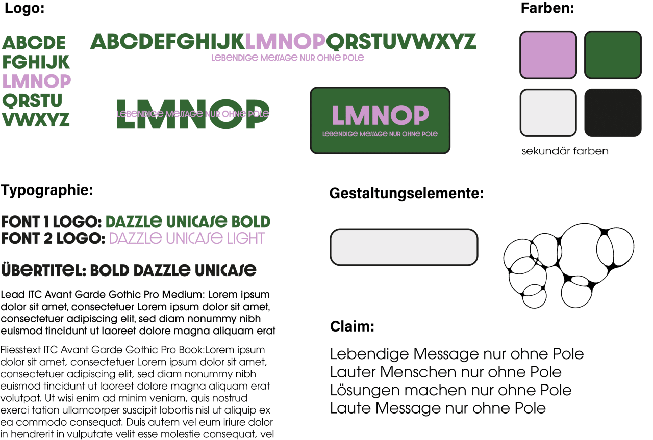 Das Logo selber war aber noch kein richtiges Logo mit Charakter. Daraufhin setzte ich mich nochmal dran und überlegte mir, wie ein Logo mit dem Namen LMNOP auch das Thema Zwischenräume visualisieren konnte. Ich liess mich von all unseren Ideen inspirieren und gelang schlussendlich zu einer recht simplen und doch einheitlichen Lösung, passend zu den Bubbles: