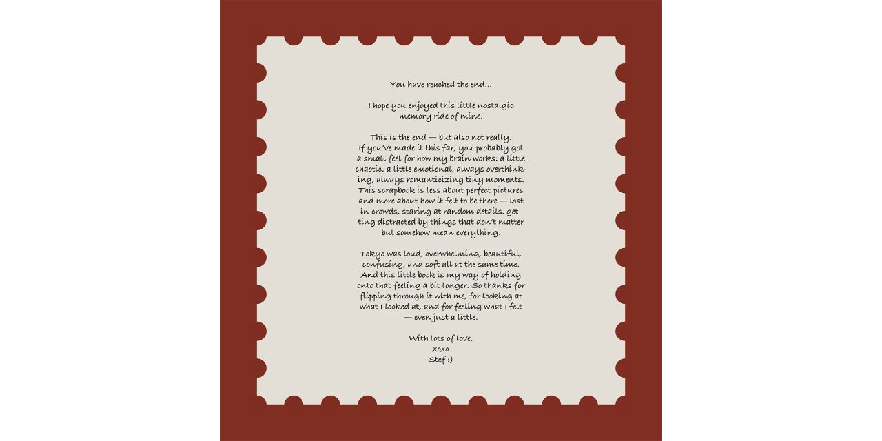 Das Scrapbook ist weniger ein Ort für perfekte Erinnerungen als für ehrliche. Es geht nicht darum, Tokyo zu erklären, sondern darum, meine Zeit dort spürbar zu machen – mit all den Widersprüchen, die dazugehören. Ein kleines visuelles Tagebuch, das man durchblättern kann, um noch einmal in diese Reise einzutauchen.