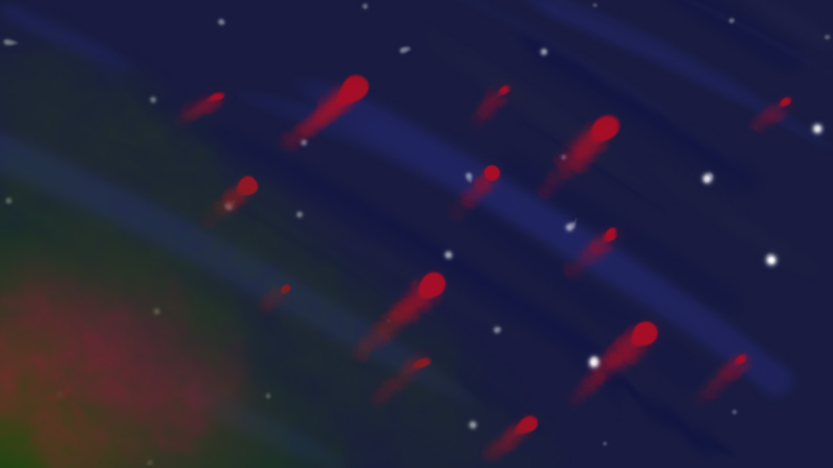 Auf der aufgeschnittenen Oberfläche der Orange waren riesige Wassertropfen zu sehen. Sekunden später, beim Zusammenprall der Orange und der Avocado, spritze es eben diese Tropfen auf die Avocado und auch durch das Leck in Ynos Anzug. Er spürte wie die Säure auf seiner Haut und in seinen Atemwegen brannte. Benommen stand er auf und beobachtete nun die Wassermelone im Zentrum. Als wäre eine unsichtbare Presse am Werk, quetschte es die Halbkugel immer weiter zusammen. Plötzlich erblickte er sein Raumschiff, wie es sich – mehrere hundert Meter entfernt – durch die Leere bewegte. Yno flog hinüber zur Orange und versuchte – nach Atem ringend – besser zu sehen wo es hinglitt. Ein weiterer Knall brachte ihn von seinem Kurs ab. Der Granatapfel war mit dem Pfirsich zusammengestossen und die kleineren, roten Kerne des Granatapfels schwirrten umher. Yno packte seinen Mumm zusammen und stiess sich vom Boden weg um sich ein solches rotes ‘Taxi’ zu schnappen. Es gelang ihm. Der Kern trug ihn weit nach rechts oben, wo er sein Raumschiff das letzte Mal gesehen hatte. Die Anstrengung wurde unerträglich, Yno kriegte kaum Luft. Er sprang wieder ab um einen Kern mit einem besseren Kurs zu erwischen.