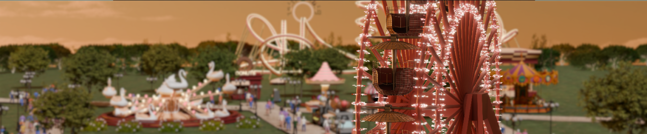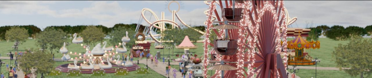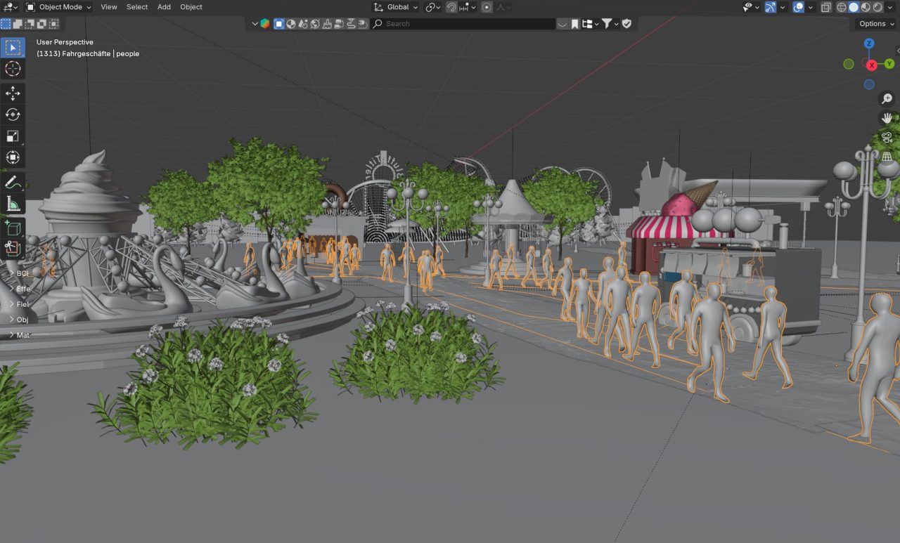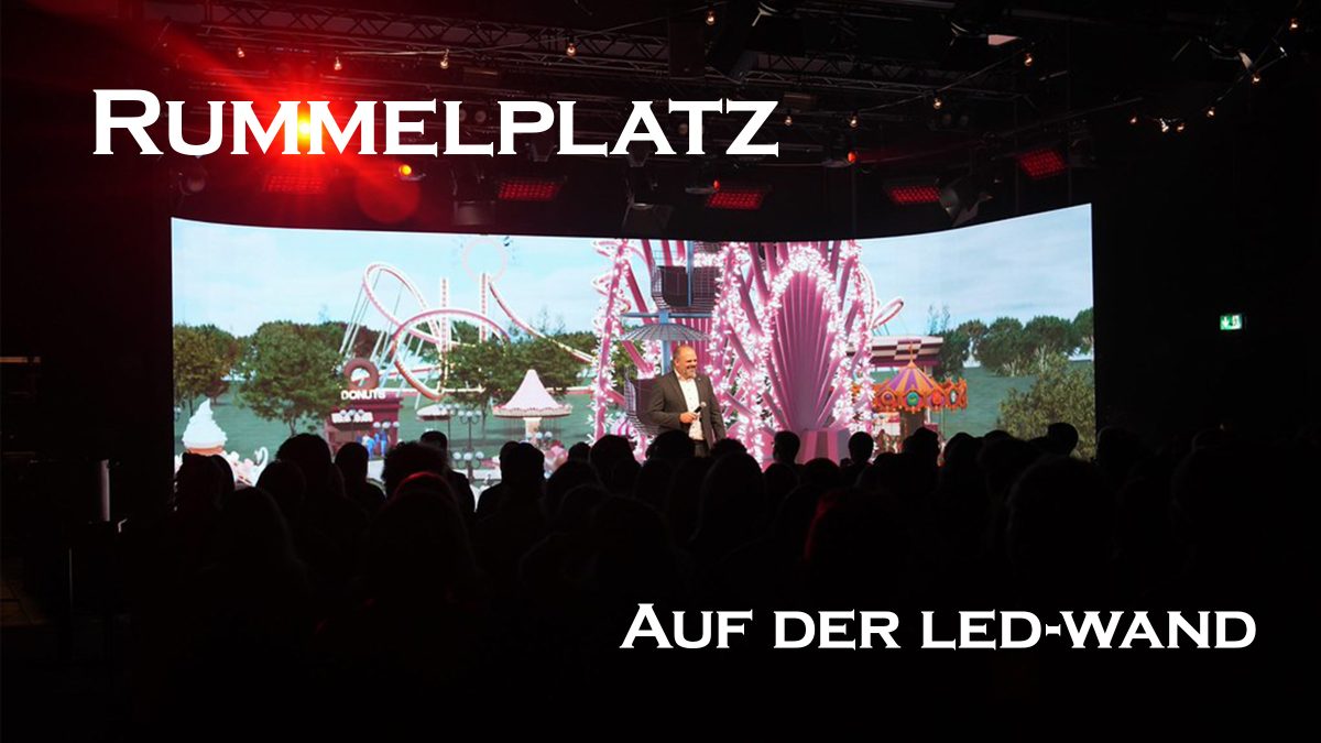 Ein Riesenrad dreht sich langsam vor einem Abendhimmel. Lichterketten blinken in den CD-Farben des Events, im Hintergrund schlendert eine Menschenmenge zwischen den Buden umher. Diese Szenerie entstand komplett in Blender – und wurde auf einer 15 Meter breiten, gebogenen LED-Wand zum Leben erweckt.
