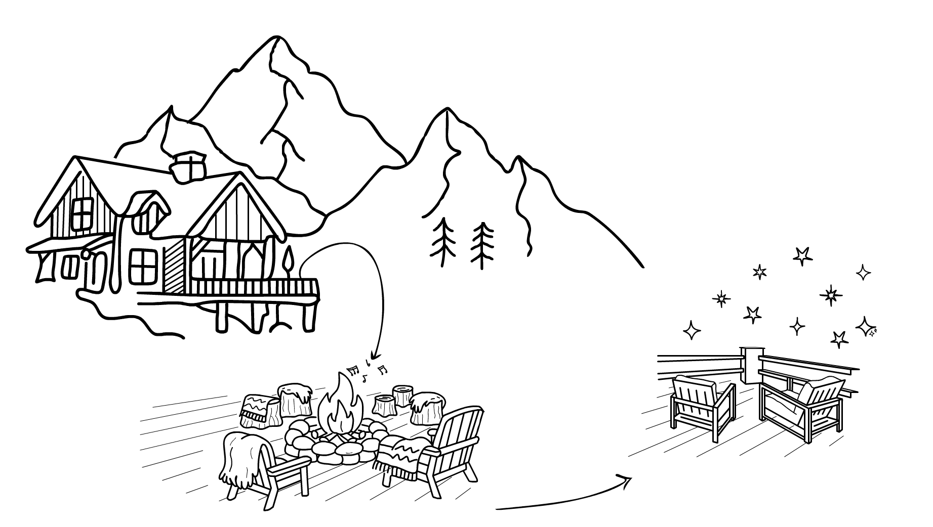 The big terrace acts as the heart of The Cabin. It offers an outdoor space with cosy blankets, a fireplace for warmth and making s’mores while enjoying the crazy views of the surrounding mountains. Designed as a place to linger, it allows time to slow down and conversations to unfold naturally. For those who want to enjoy the night sky, a darker side of the terrace remains free from light pollution, making the stars clearly visible.