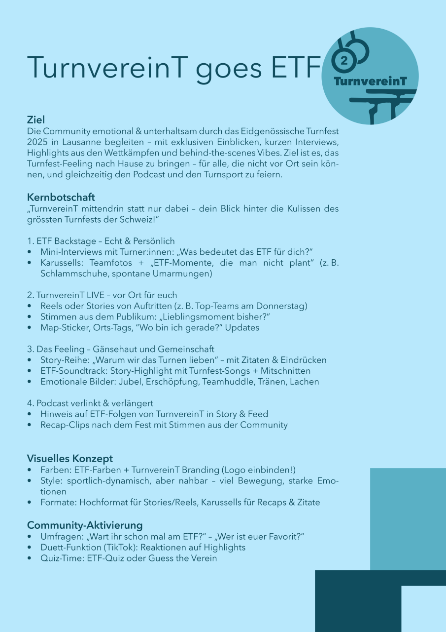 Nun steht ein ganz besonderes Ereignis bevor, zu dem ich ein Social-Media-Konzept erstellt habe, um meine Follower auf Insta mitzunehmen. Denn bald steht bereits das Eidgenössische Turnfest, kurz ETF, an. Die Vorfreude ist gross, denn es findet nur alle sechs Jahre statt. Es ist ein Anlass, der den ganzen Schweizer Turnsport zusammenbringt, vom klassischen Geräteturnen und Vereinsgeräteturnen, übers Kunstturnen, Gymnastik und Leichtathletik bis hin zum Trampolinspringen und Rhönrad. Es ist eine Gemeinschaft, die da zusammenkommt, ihre Leidenschaft zum Sport auslebt und zusammen feiert. Sportler:innen aus der ganzen Schweiz versammeln sich in Lausanne über die beiden Wochen jeweils von Donnerstag bis Sonntag. Vom 12. bis zum 15. Juni 2025 finden die Jugend- und Einzelwettkämpfe statt, vom 19. bis zum 22. Juni 2025 folgen dann die Wettkämpfe der Aktiven in der Vereinswertung. Am Ende werden die Wertungen der einzelnen Disziplinen pro Verein zusammengezählt und einer der Vereine wird Turnfestsieger, eine ganz besondere Auszeichnung, da man in allen Disziplinen punkten muss, um zu gewinnen.