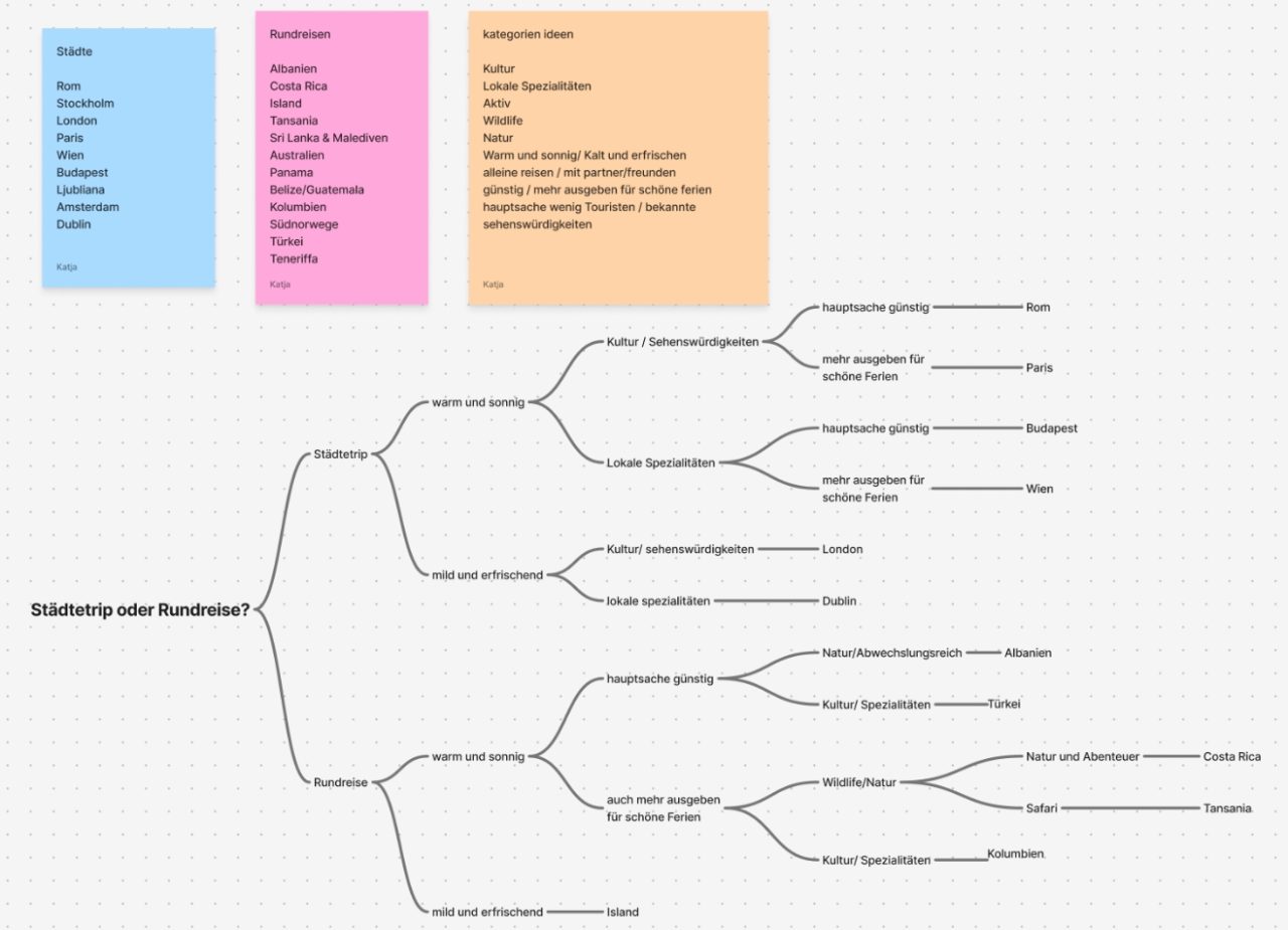Aus der Kombination von den Destinationen und den Kategorien haben wir einen Pfad für den Test erstellt, also welche Kategorien zu welchen Destinationen führen, damit am Schluss jeweils eine Destination übrig bleibt. Einige Destinationen, wie Stockholm, Australien, Norwegen oder Panama sind noch nicht in unserem Test integriert. Diese würden dazu kommen, wenn wir den Test erweitern.
