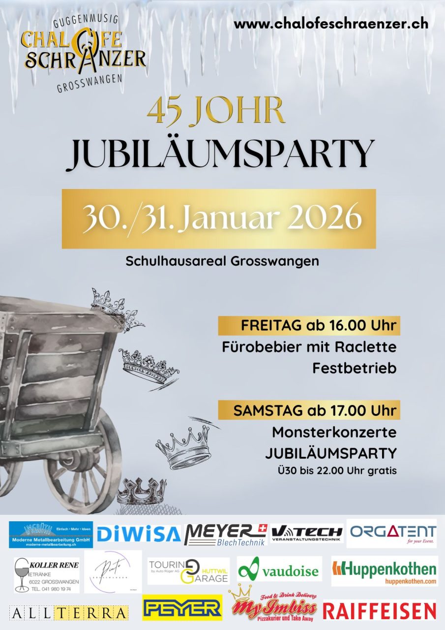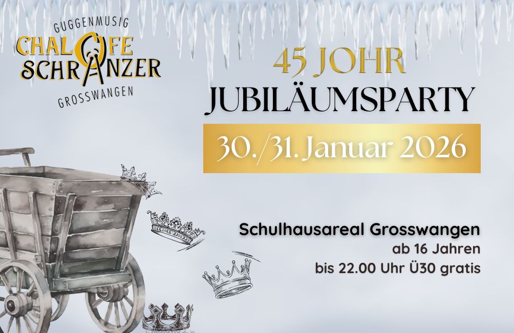 Die 5. Jahreszeit steht vor der Türe und Fasnächtler:innen stehen in den Startlöchern für die Vorfasnacht. Die Luzerner Guggenmusik «Chalofeschränzer Grosswangen» feiert in der diesjährigen Fasnacht ihr 45-jähriges Jubiläum. Dies ist ein Grund zum Feiern. Deshalb organisiert die Guggenmusik am letzten Wochenende im Januar 2026 eine Jubiläumsparty.