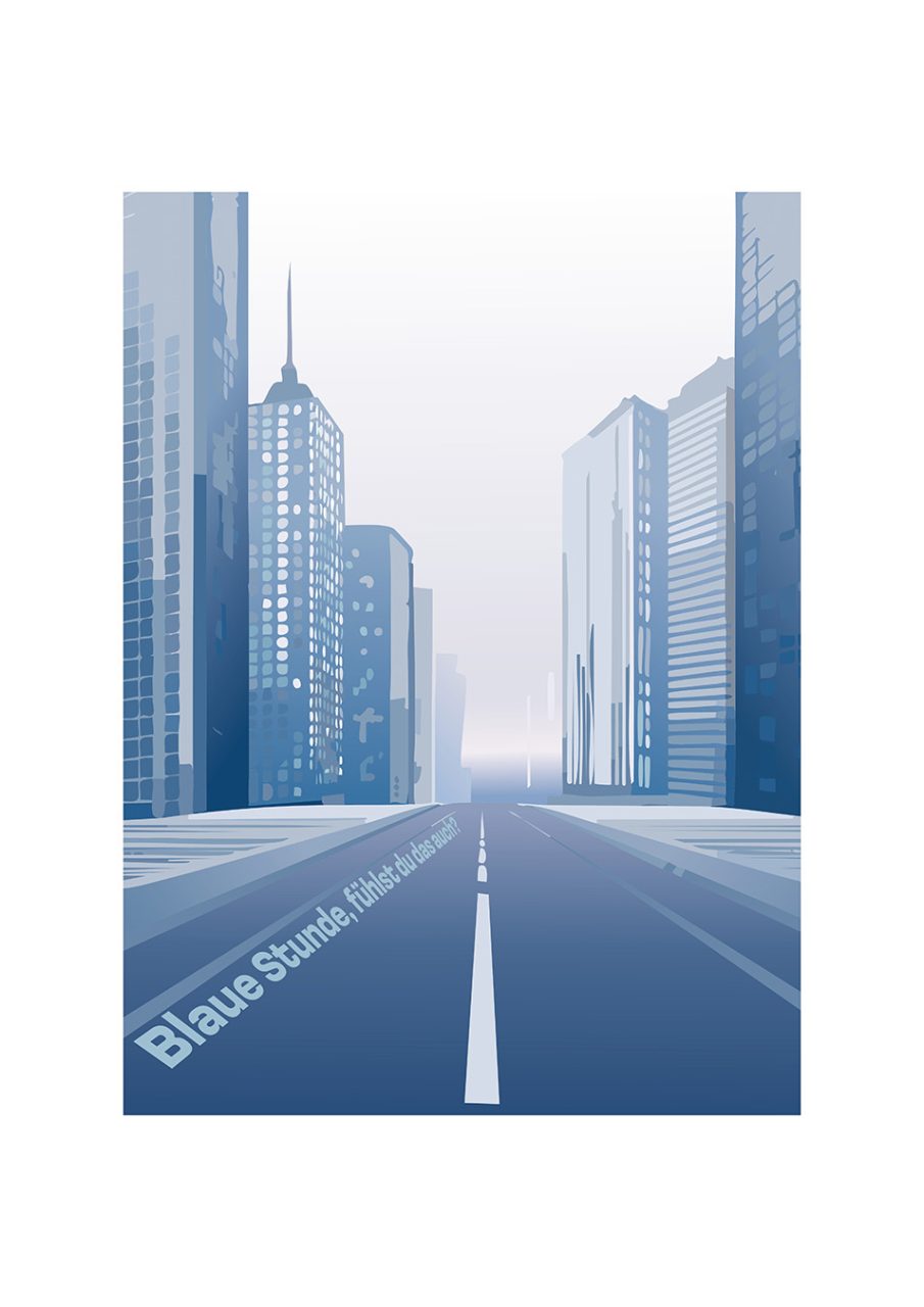 Beim zweiten Plakat experimentierte ich mit der AI-Funktion in Adobe Illustrator. Zum Lied Blaue Stunde hatte ich von Anfang an ein sehr klares Bild im Kopf. Dieses versuchte ich mithilfe von AI nachzuahmen. Anschliessend passte ich Details manuell an, verfeinerte Formen und bestimmte die Farben. Ich entschied mich bewusst für verschiedene Blautöne, da Blau eine Farbe ist, mit der ich mich wohlfühle. Zusätzlich achtete ich darauf, dass die Farben mit meiner Wolldecke harmonieren.