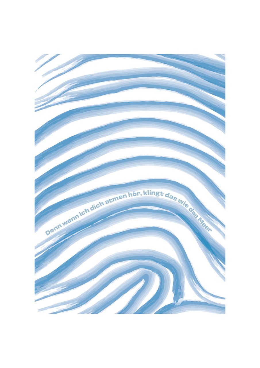 Für das Meer-Plakat wollte ich ein Motiv, das an Wellen erinnert. Um das Ganze persönlicher zu machen, nahm ich den Fingerabdruck meines Freundes als Ausgangspunkt (voll cheesy, ich weiss). Ich zeichnete das Muster so nach, dass eine Mischung aus Fingerabdruck und Wellenstruktur entstand. Das Resultat sollte ruhig und organisch wirken. Zwischen die Linien integrierte ich ein Zitat aus dem Song. Dafür arbeitete ich mit Adobe Illustrator und InDesign.